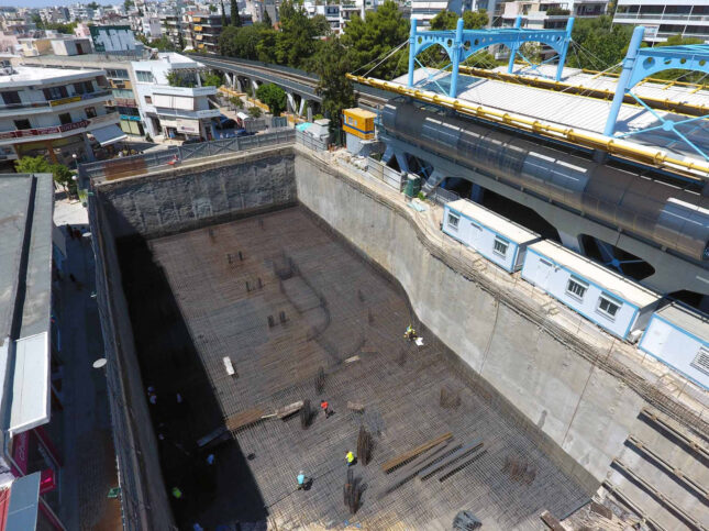 Οι εργασίες που σχετίζονται με την αντιστήριξη έχουν να κάνουν καταρχήν με την κατασκευή φρεατοπασσάλλων Φ800 και μικροπασσάλων Φ250/Φ270 οπλισμένων με ΗΕΒ160 όπου υπάρχει περιορισμός ύψους (λογω σκέπαστρων ή υπόστεγων του παρακείμενου σταθμού του ΗΣΑΠ). Κατόπιν και αφού οριοθετηθεί το περίγραμμα με την κατασκευή των πασσάλων κατασκευάζεται περιμετρικά κεφαλόδεσμος.