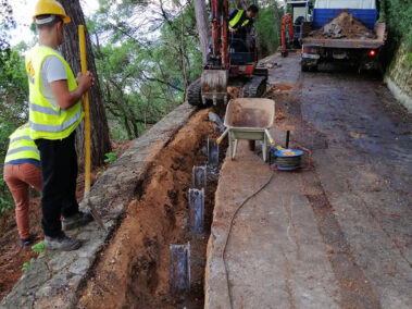 Οι εργασίες ενίσχυσης του οδικού δικτύου και προστασίας του υφιστάμενου στα κατάντι του οδικού δικτύου πέτρινου περιμετρικού τοιχίου αντιστήριξης, περιλαμβάνουν την κατασκευή μικροπασσάλων και του αντίστοιχου κεφαλοδέσμου. Οι πάσσαλοι είναι κατασκευασμένοι σε γραμμική απόσταση 1 μέτρου, έχουν διάμετρο 300χιλ και κυμαινόμενο μήκος από 4 έως 12 μέτρα ανάλογα της φυσιολογίας του εδάφους και της εμφάνισης του υγιούς βραχώδους υποβάθρου.