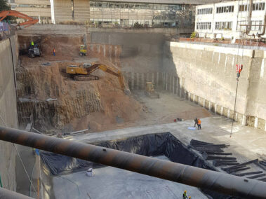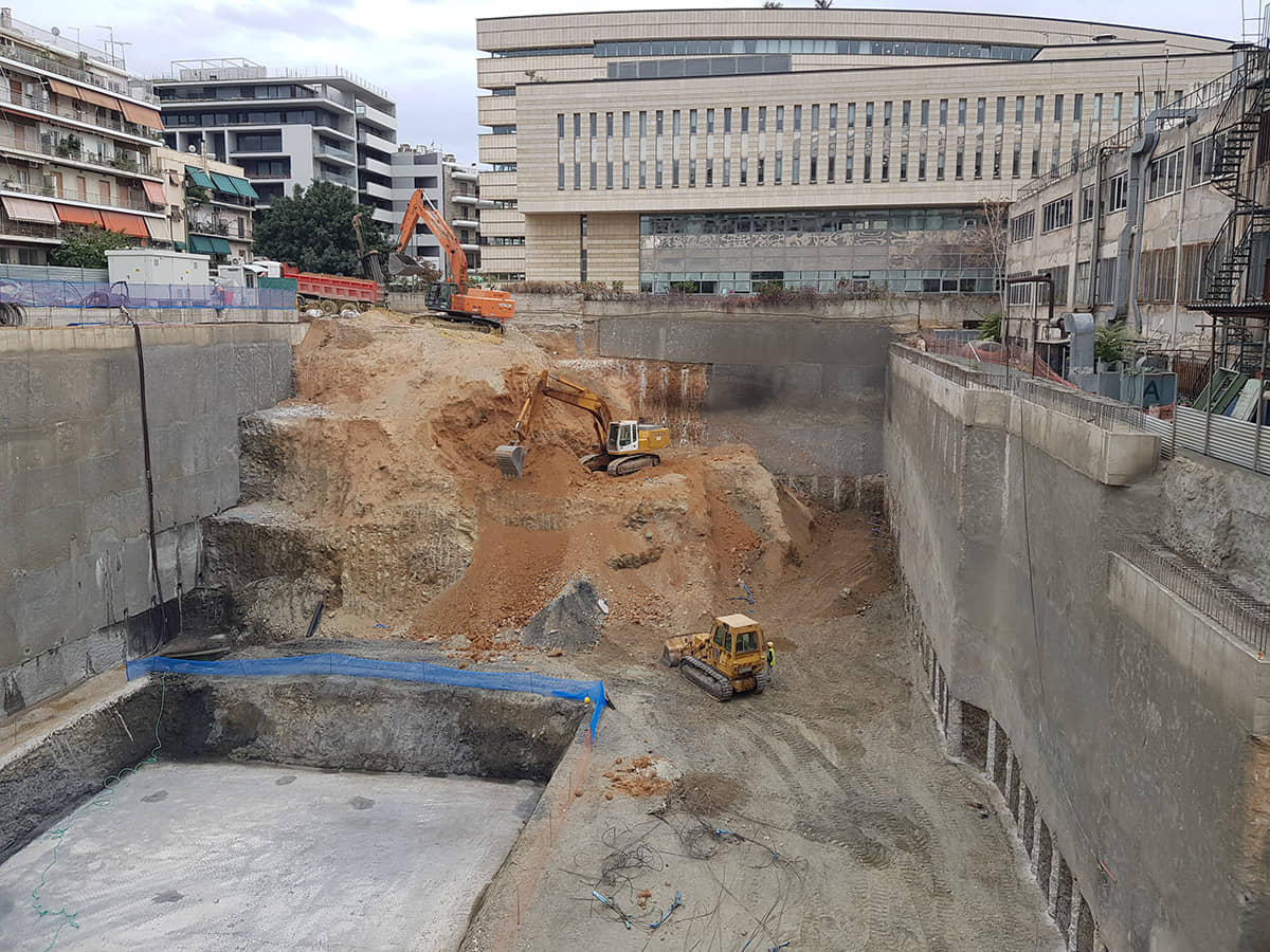 Πρόβλημα στην αντιστήριξη των πλευρών της εκσκαφής αποτέλεσε η γειτνίαση της από την πλευρά της Λεωφόρου Συγγρού όμορης πολυκατοικίας με δύο υπόγεια, από την νότια πλευρά με το κτήριο της Εθνικής Ασφαλιστικής, ενώ από τις πλευρές της Λαγουμιτζή και της Ευρυδάμαντος πρόβλημα δημιούργησε η ύπαρξη κάτω διαβάσεων οδών ειδικά στην κατασκευή των προεντεταμένων αγκυρώσεων (διατρήσεις με σύγχρονες τοπογραφικές μεθόδους με χρήση αζιμουθίου και κατακόρυφων γωνιών).